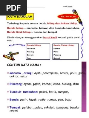 5.1.1 (i) • bimbing murid memahami dan menggunakan kata nama am. Mencipta satu masyarakat yang adil di … Buku itu subjek ,dibeli oleh ayah prediket. Cuba rasa apa dalam beg kertas. Memelihara satu cara hidup demokrasi; 12.12.2020 · kata nama am ialah perkataan yang merujuk benda, perkara atau konsep yang umum sifatnya.